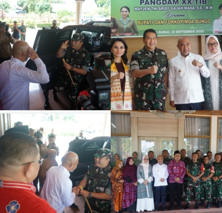 Dalam suasana hangat penuh kekeluargaan, Pangdam XX/Tuanku Imam Bonjol, Mayjen TNI Arief Gajah Mada, S.E., M.M., melaksanakan silaturahmi bersama jajaran Forkopimda Kabupaten Bungo di Pendopo Rumah Dinas Bupati Bungo, Jalan Lintas Sumatera KM. 16, Muara Bungo, Kecamatan Bathin II Babeko, Kabupaten Bungo, Jambi. Jum’at (12/09/2025).