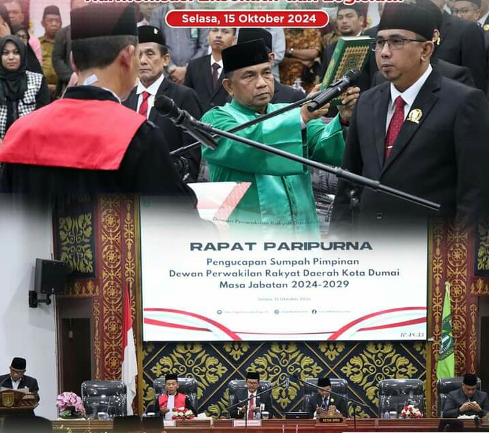 Hal tersebut disampaikannya pada acara Rapat Paripurna Pengucapan Sumpah/Janji Pimpinan Defenitif DPRD Kota Dumai Masa Jabatan 2024-2029 yang berlangsung di Ruang Rapat Paripurna DPRD Kota Dumai Jalan Tuanku Tambusai, Bagan Besar, Selasa (15/10/2024).