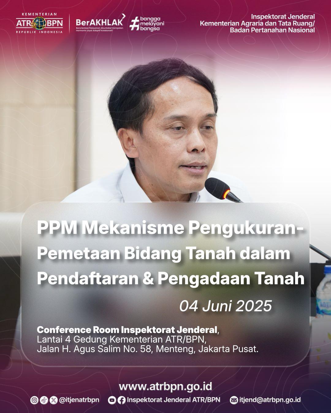 Jakarta – Inspektorat Jenderal Kementerian Agraria dan Tata Ruang/Badan Pertanahan Nasional (ATR/BPN) menyelenggarakan Pelatihan Pengembangan Mandiri (PPM) dengan tema “Mekanisme Pengukuran dan Pemetaan Bidang Tanah dalam Pendaftaran dan Pengadaan Tanah”. Kegiatan ini digelar pada Rabu, 4 Juni 2025 di Conference Room Lantai 4 Gedung Inspektorat Jenderal Kementerian ATR/BPN, Menteng, Jakarta Pusat.