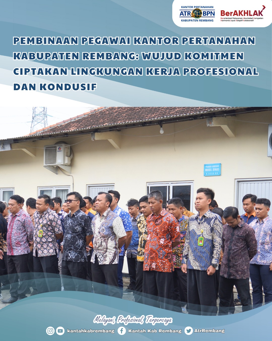 Kegiatan pembinaan ini menjadi momentum penyegaran nilai-nilai kedisiplinan dan profesionalisme, sekaligus wujud nyata komitmen pimpinan dalam membangun budaya kerja positif dan harmonis di lingkungan Kantor Pertanahan Kabupaten Rembang.