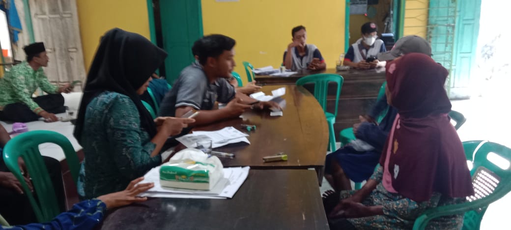Kepala Desa Bumi Restu SUKIMAN , Saat Berbincang dengan warga yang sedang mengantre untuk menerima bantuan pangan.