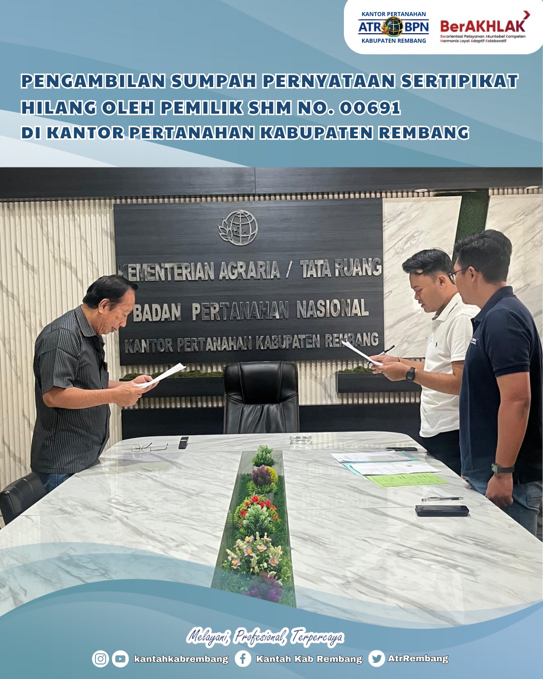 Pengambilan sumpah ini merupakan salah satu tahapan penting dalam proses penggantian sertipikat tanah yang dinyatakan hilang, sesuai dengan ketentuan yang berlaku dalam Peraturan Menteri Agraria dan Tata Ruang/Kepala Badan Pertanahan Nasional. Dalam pelaksanaannya, kegiatan ini turut disaksikan oleh pejabat Kantor Pertanahan Kabupaten Rembang serta dua orang saksi.