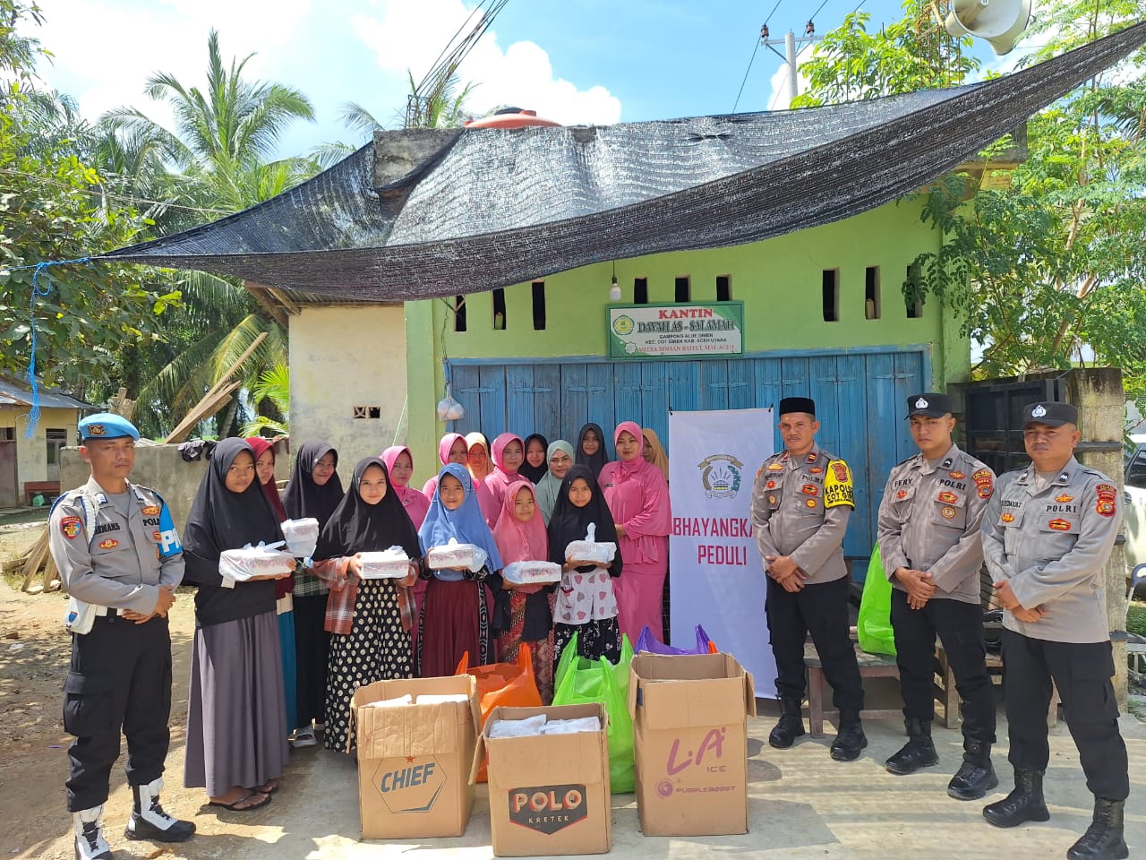 Ketua Bayangkari Cabang Aceh Utara, Ny Rika Nanang Indra bakti, melalui ketua Bhayangkari ranting Cot girek dan didampingi oleh Kapolsek cot girek dalam rangka “BHAYANGKARI PEDULI” kepada kompas86.com, mengatakan penyerahan santunan ini sebagai bentuk kepedulian kepada puluhan anak yatim.