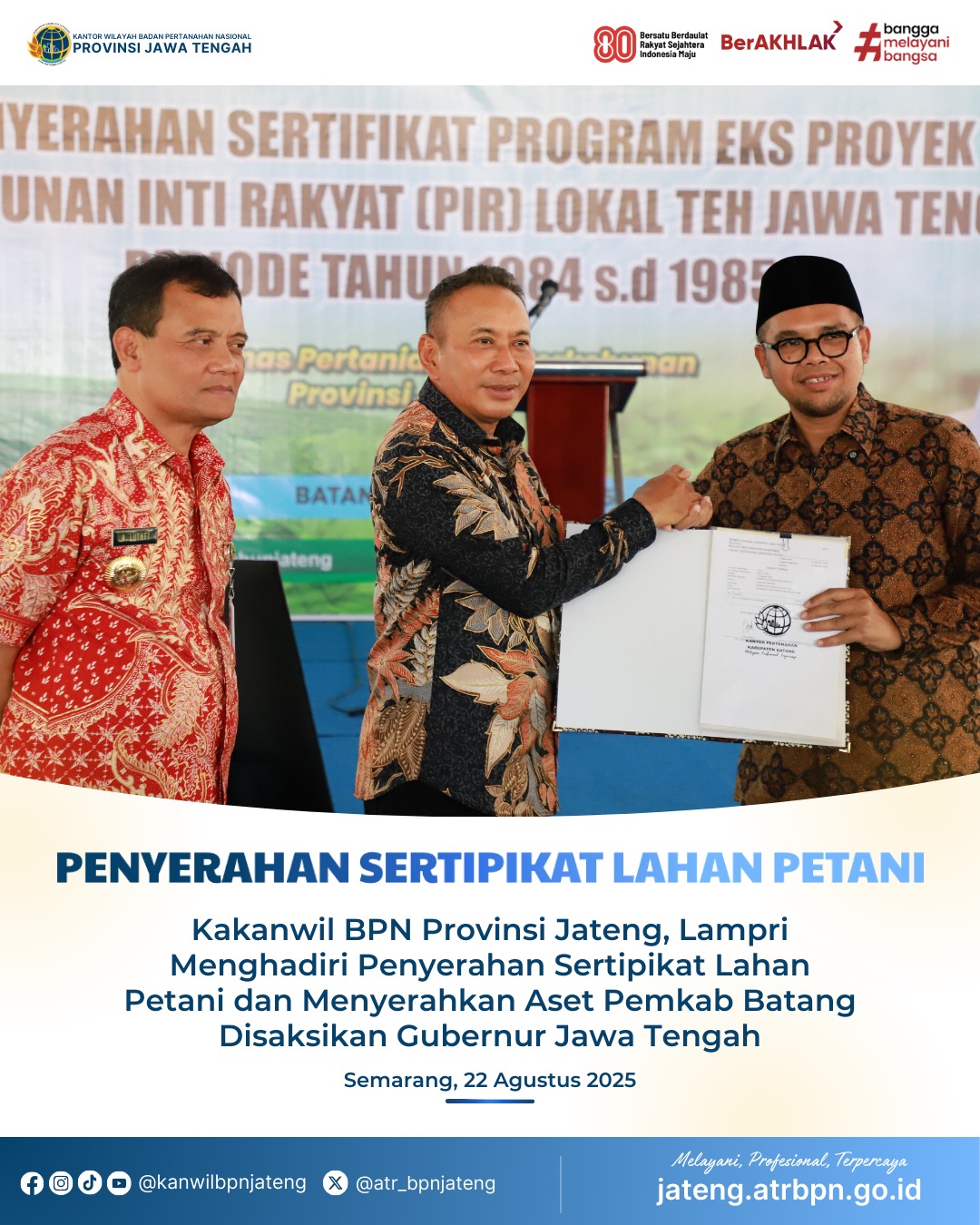 Selain penyerahan sertipikat untuk petani, kegiatan ini juga dirangkaikan dengan penyerahan 4 sertipikat aset Pemerintah Kabupaten Batang dari Lampri, Kepala Kanwil Badan Pertanahan Nasional Provinsi Jawa Tengah, kepada Bupati Batang Faiz Kurniawan. Penyerahan tersebut dilakukan secara resmi di hadapan Gubernur Ahmad Luthfi sebagai bentuk komitmen penataan dan pengamanan aset daerah.