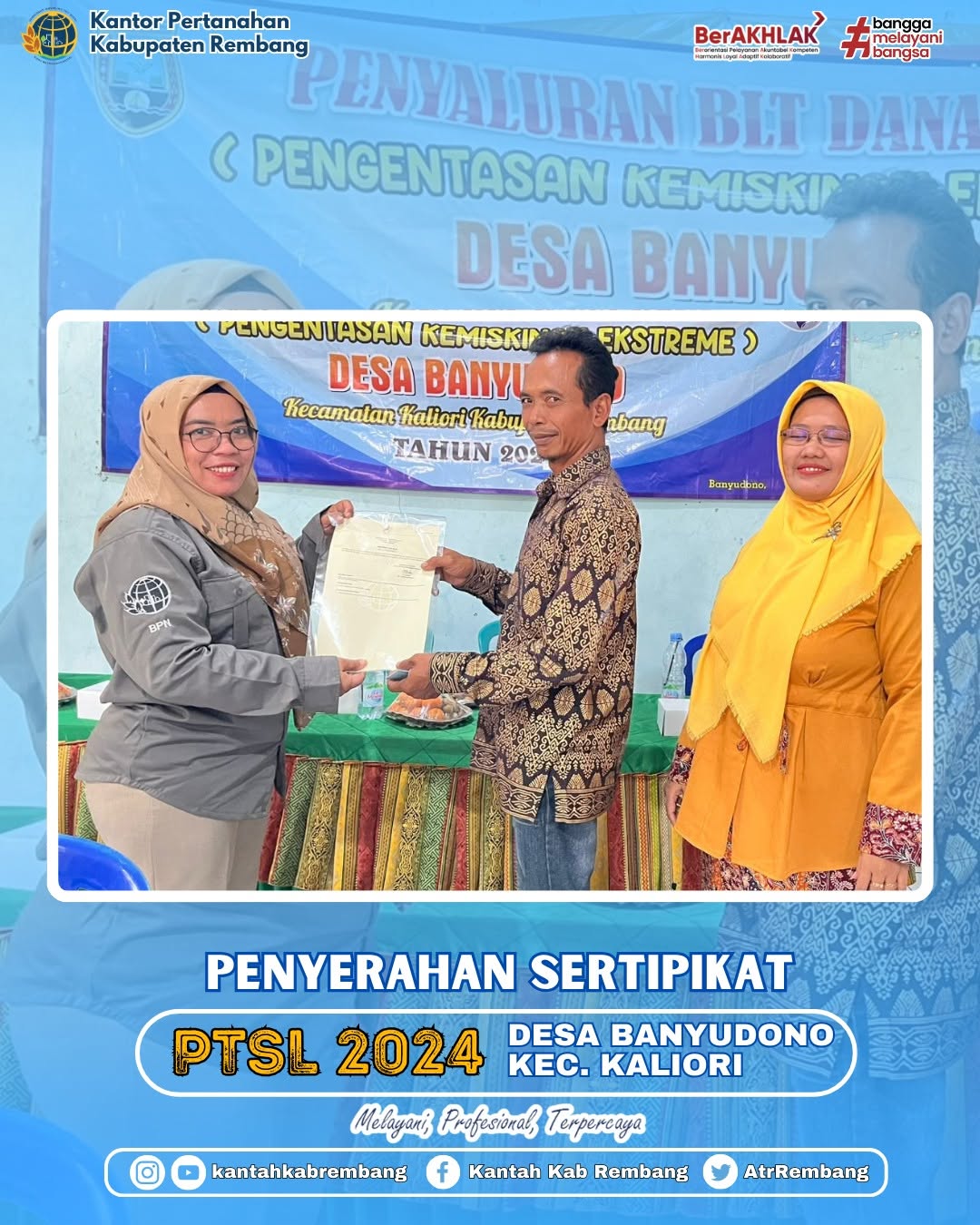 Rembang – Kantor Pertanahan Kabupaten Rembang melalui TIM I menyerahkan 54 Sertipikat program Pendaftaran Tanah Sistematis Lengkap (PTSL) Tahun Anggaran 2024 di Desa Banyudono Kecamatan Kaliori pada Kamis (23/01/2025).