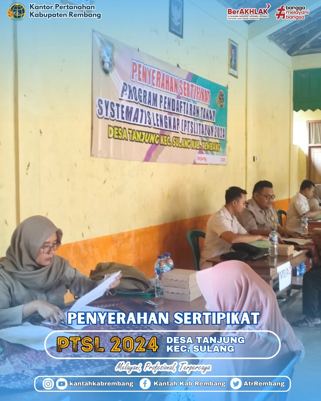 Rembang, Kompas86.com – Halo #SobATRBPN, Kantor Pertanahan Kabupaten Rembang melalui TIM II menyerahkan Sertipikat program Pendaftaran Tanah Sistematis Lengkap (PTSL) Tahun Anggaran 2024 di Desa Tanjung Kecamatan Sulang pada Selasa (11/02/2025).