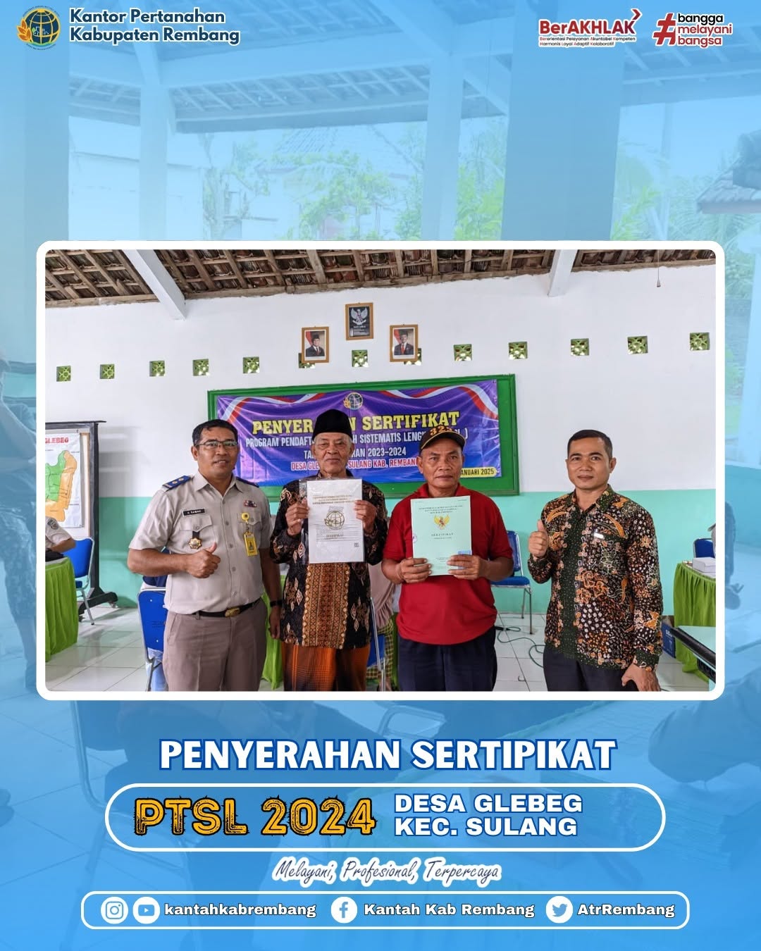 Rembang – Kantor Pertanahan Kabupaten Rembang melalui TIM II menyerahkan Sertipikat program Pendaftaran Tanah Sistematis Lengkap (PTSL) Tahun Anggaran 2024 di Desa Glebeg Kecamatan Sulang pada Selasa (21/01/2025).