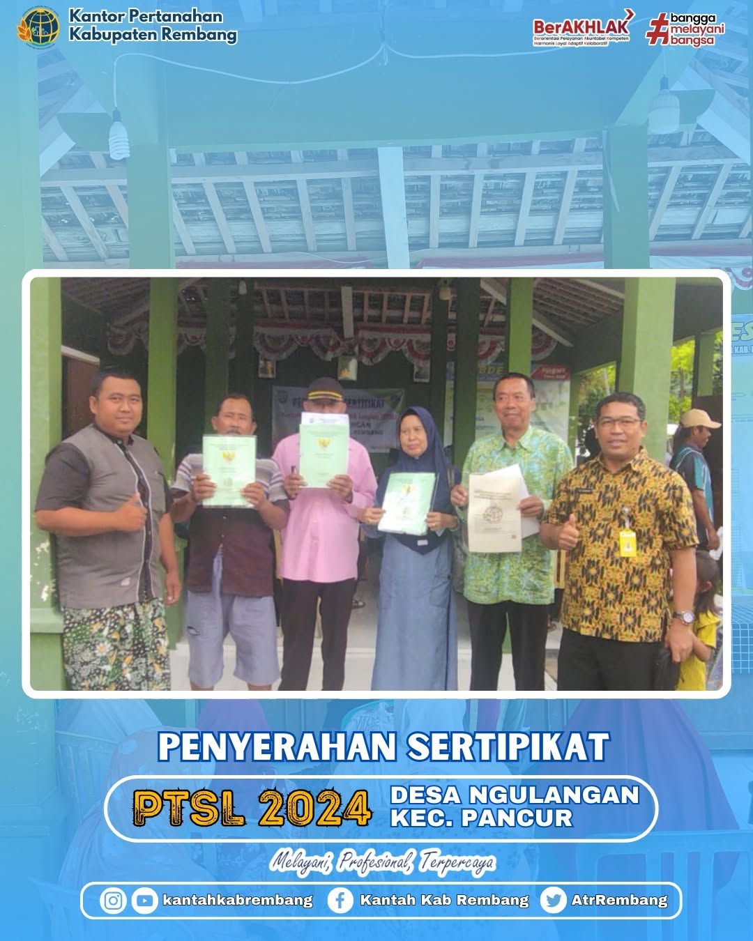 Rembang – Kantor Pertanahan Kabupaten Rembang melalui TIM II menyerahkan Sertipikat program Pendaftaran Tanah Sistematis Lengkap (PTSL) Tahun Anggaran 2024 di Desa Kulutan Kecamatan Gunem pada Rabu (15/01/2025).