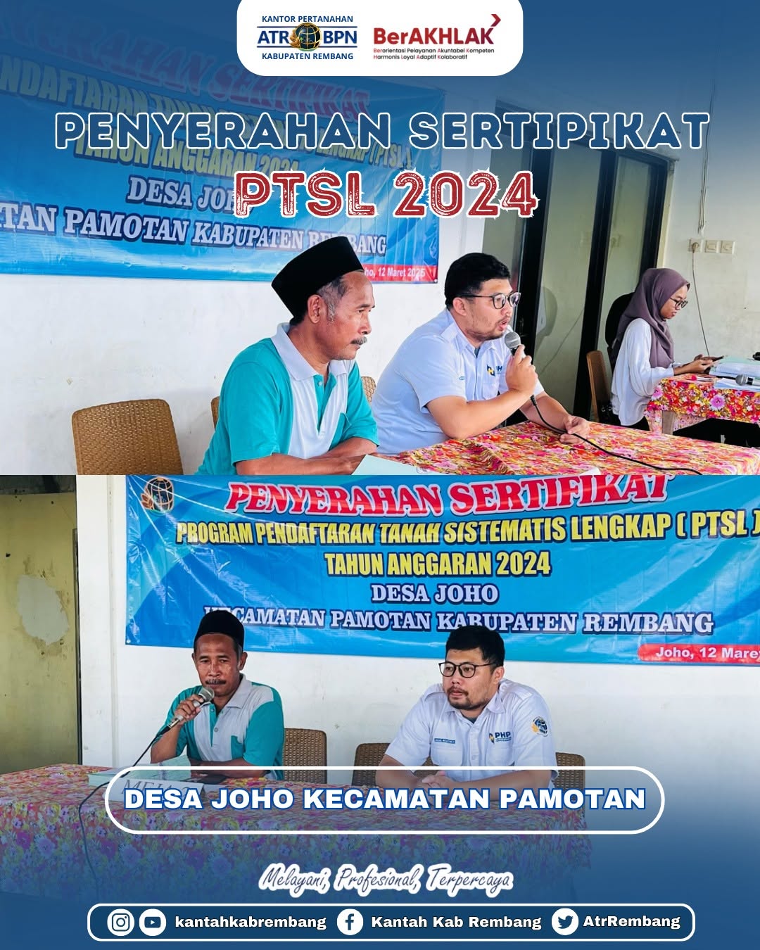 Rembang – Kantor Pertanahan Kabupaten Rembang melalui TIM I menyerahkan Sertipikat program Pendaftaran Tanah Sistematis Lengkap (PTSL) Tahun Anggaran 2024 di Desa Joho Kecamatan Pamotan pada Rabu (12/03/2025).