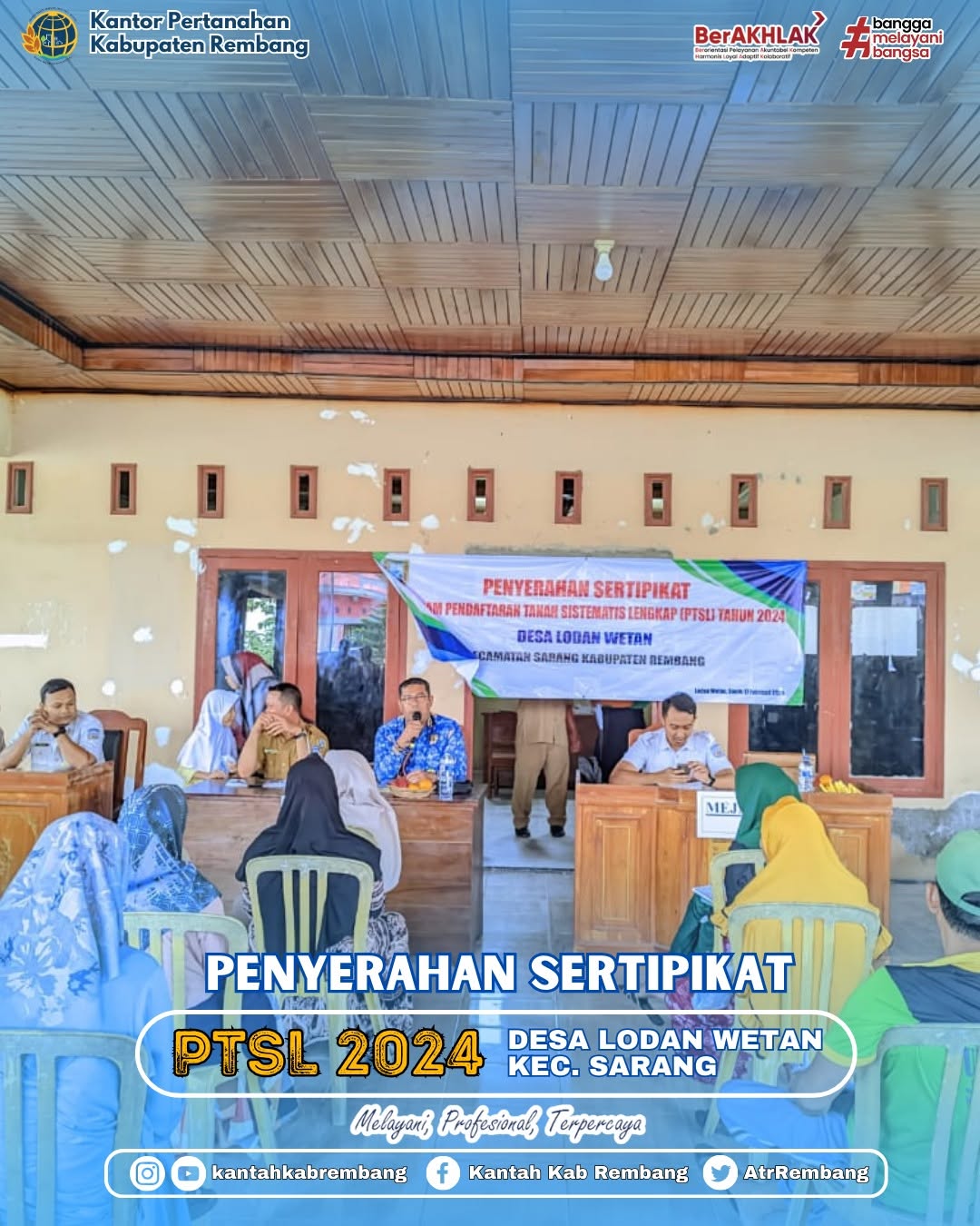 Rembang, Kompas86.com – Kantor Pertanahan Kabupaten Rembang melalui TIM II menyerahkan Sertipikat program Pendaftaran Tanah Sistematis Lengkap (PTSL) Tahun Anggaran 2024 di Desa Lodan Wetan Kecamatan Sarang pada Senin (17/02/2025).