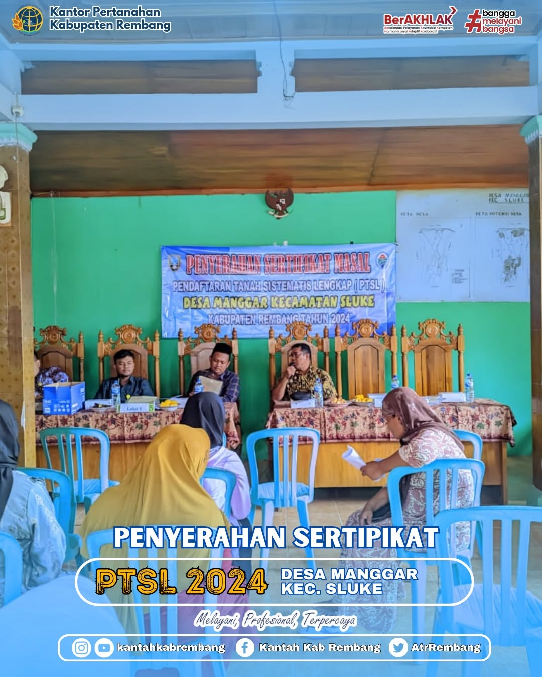 Rembang, Kompas86.com – Kantor Pertanahan Kabupaten Rembang melalui TIM II menyerahkan Sertipikat program Pendaftaran Tanah Sistematis Lengkap (PTSL) Tahun Anggaran 2024 di Desa Manggar Kecamatan Sluke pada Kamis (13/02/2025).