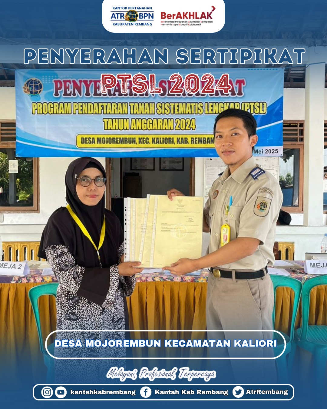 Rembang – Kantor Pertanahan Kabupaten Rembang melalui TIM I menyerahkan Sertipikat program Pendaftaran Tanah Sistematis Lengkap (PTSL) Tahun Anggaran 2024 di Desa Mojorembun Kecamatan Kaliori pada Selasa (06/05/2025).
