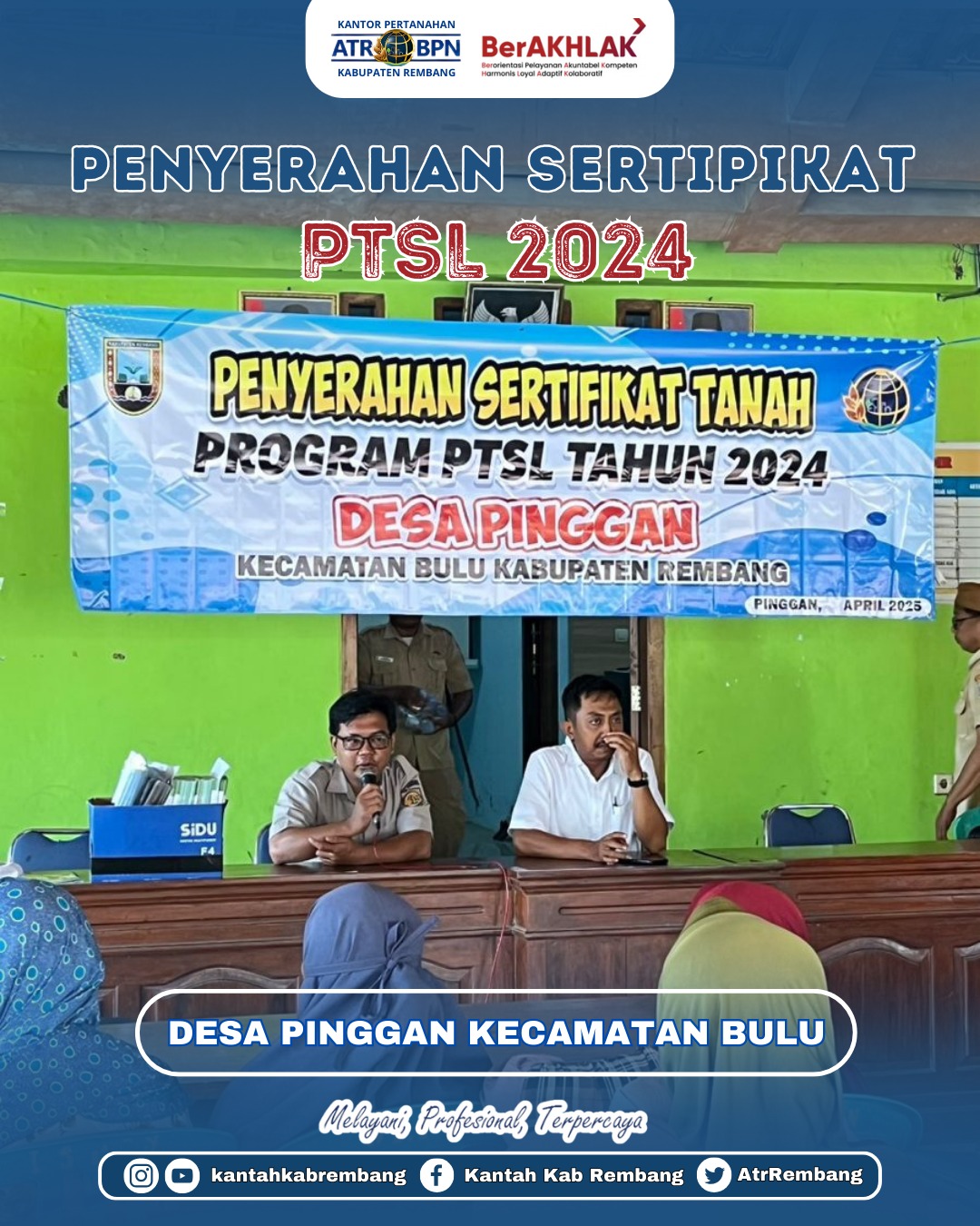 Rembang – Kantor Pertanahan Kabupaten Rembang melalui TIM I menyerahkan Sertipikat program Pendaftaran Tanah Sistematis Lengkap (PTSL) Tahun Anggaran 2024 di Desa Pinggan Kecamatan Bulu pada Senin (05/05/2025).
