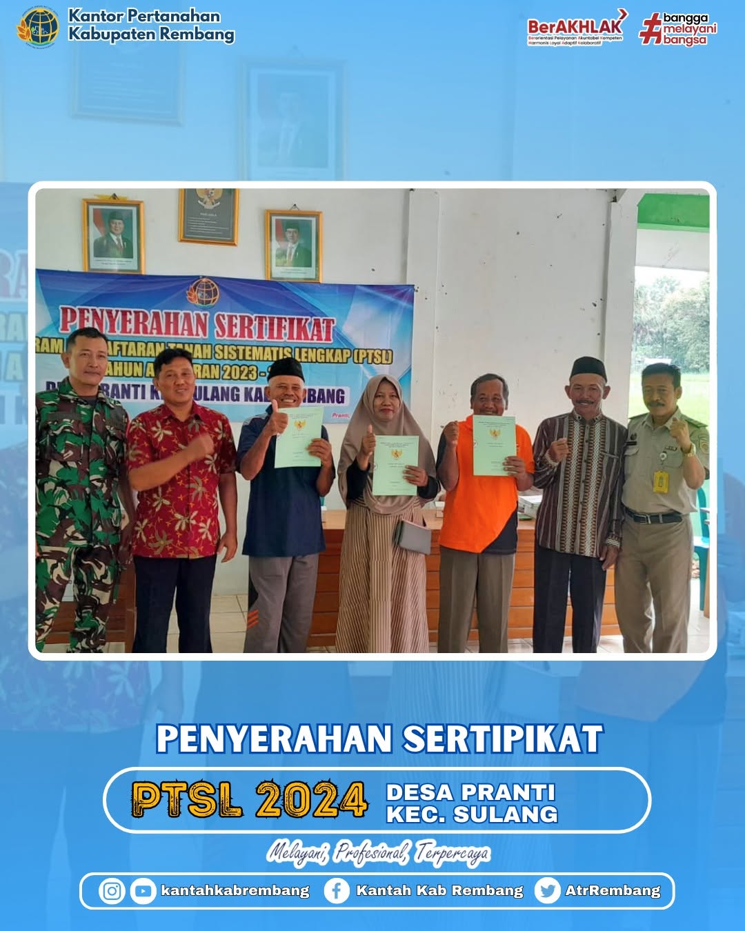 Rembang, Kompas86.com – Kantor Pertanahan Kabupaten Rembang melalui TIM III menyerahkan Sertipikat program Pendaftaran Tanah Sistematis Lengkap (PTSL) Tahun Anggaran 2024 di Desa Pranti Kecamatan Sulang pada Selasa (18/02/2025).
