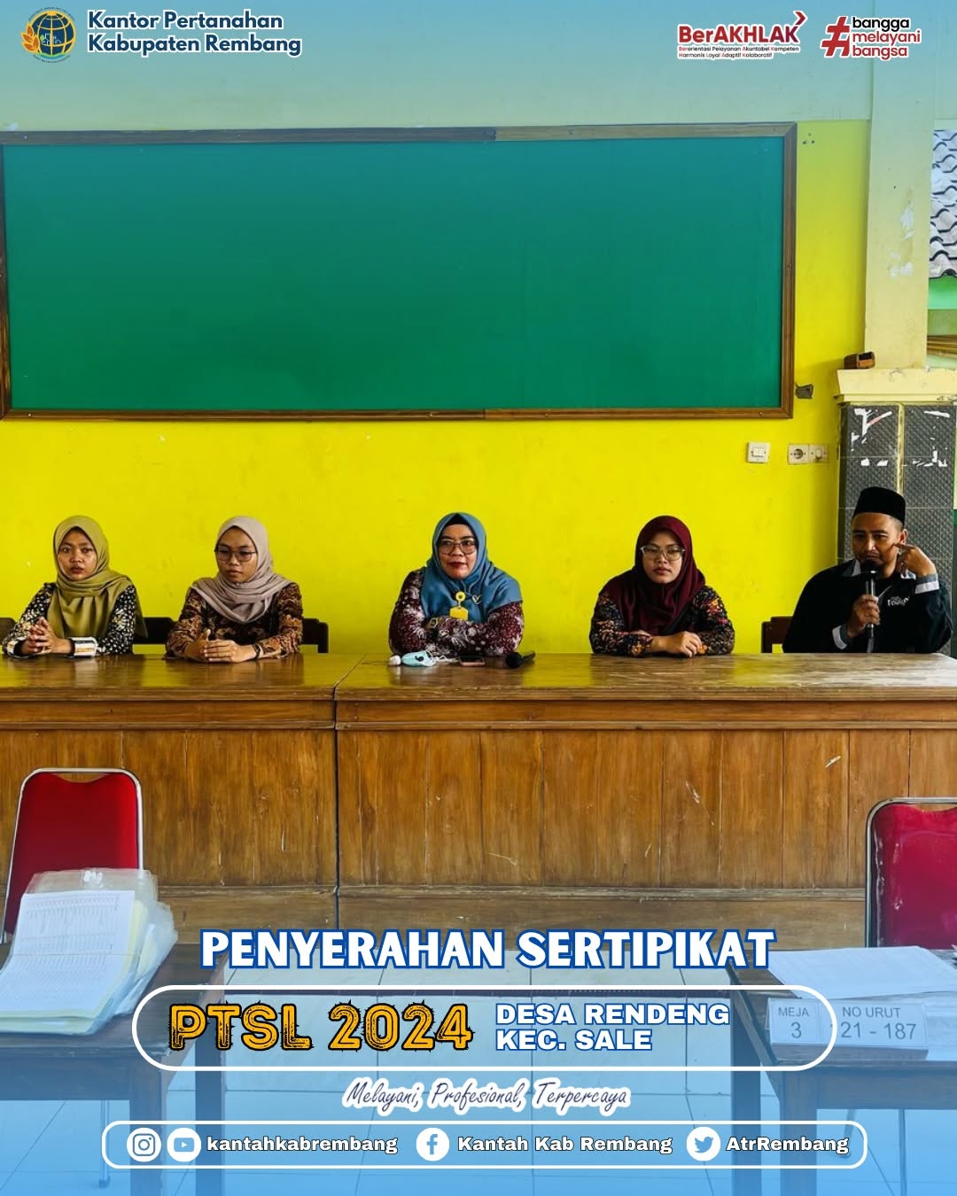 Rembang, Kompas86.com – Kantor Pertanahan Kabupaten Rembang melalui TIM I menyerahkan Sertipikat program Pendaftaran Tanah Sistematis Lengkap (PTSL) Tahun Anggaran 2024 di Desa Rendeng Kecamatan Sale pada Kamis (13/02/2025).