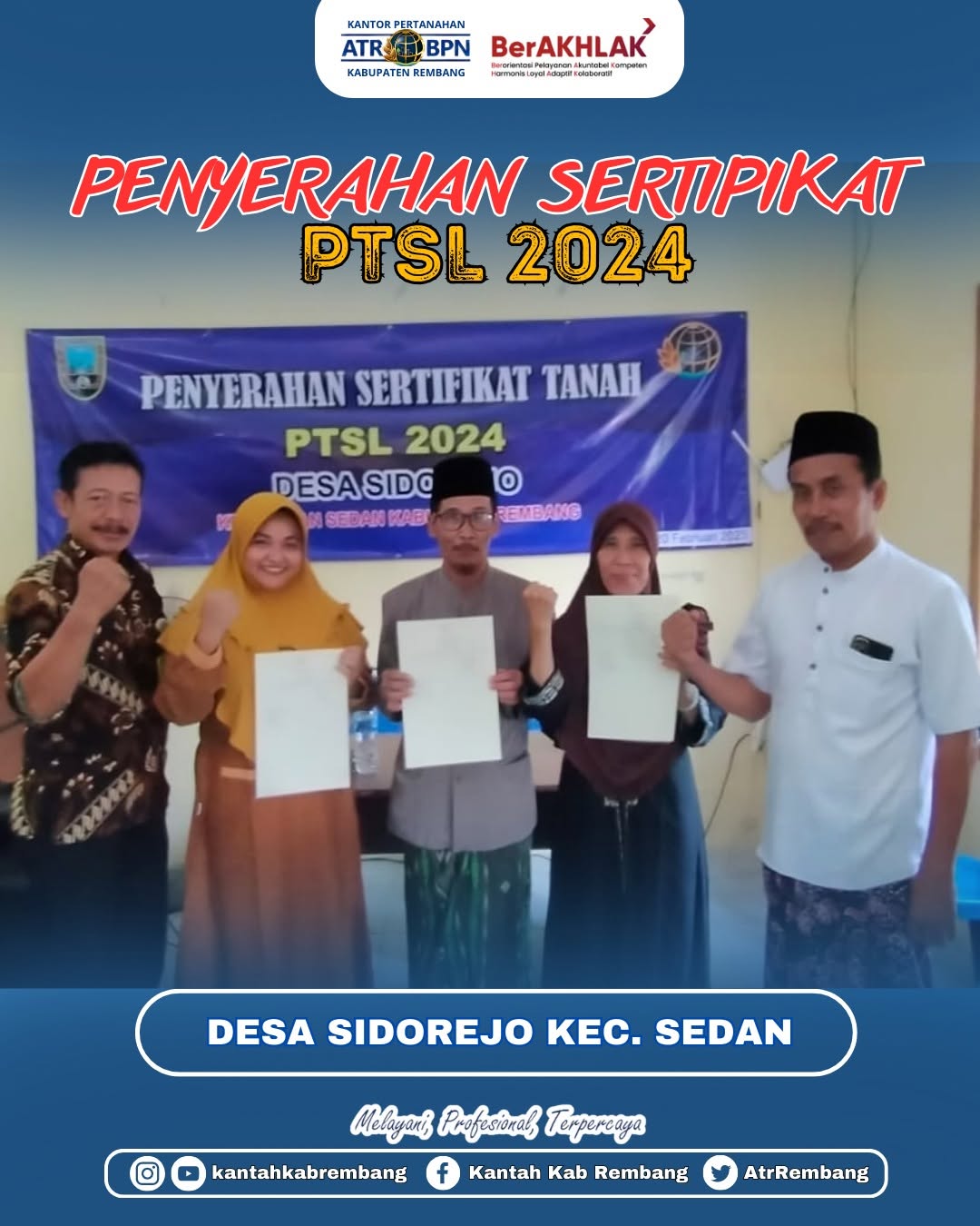 Rembang – Kantor Pertanahan Kabupaten Rembang melalui TIM III menyerahkan Sertipikat program Pendaftaran Tanah Sistematis Lengkap (PTSL) Tahun Anggaran 2024 di Desa Sidorejo Kecamatan Sedan pada Kamis (20/02/2025).