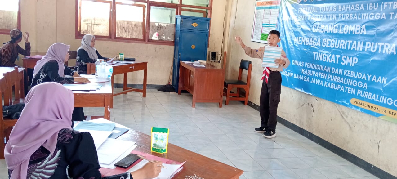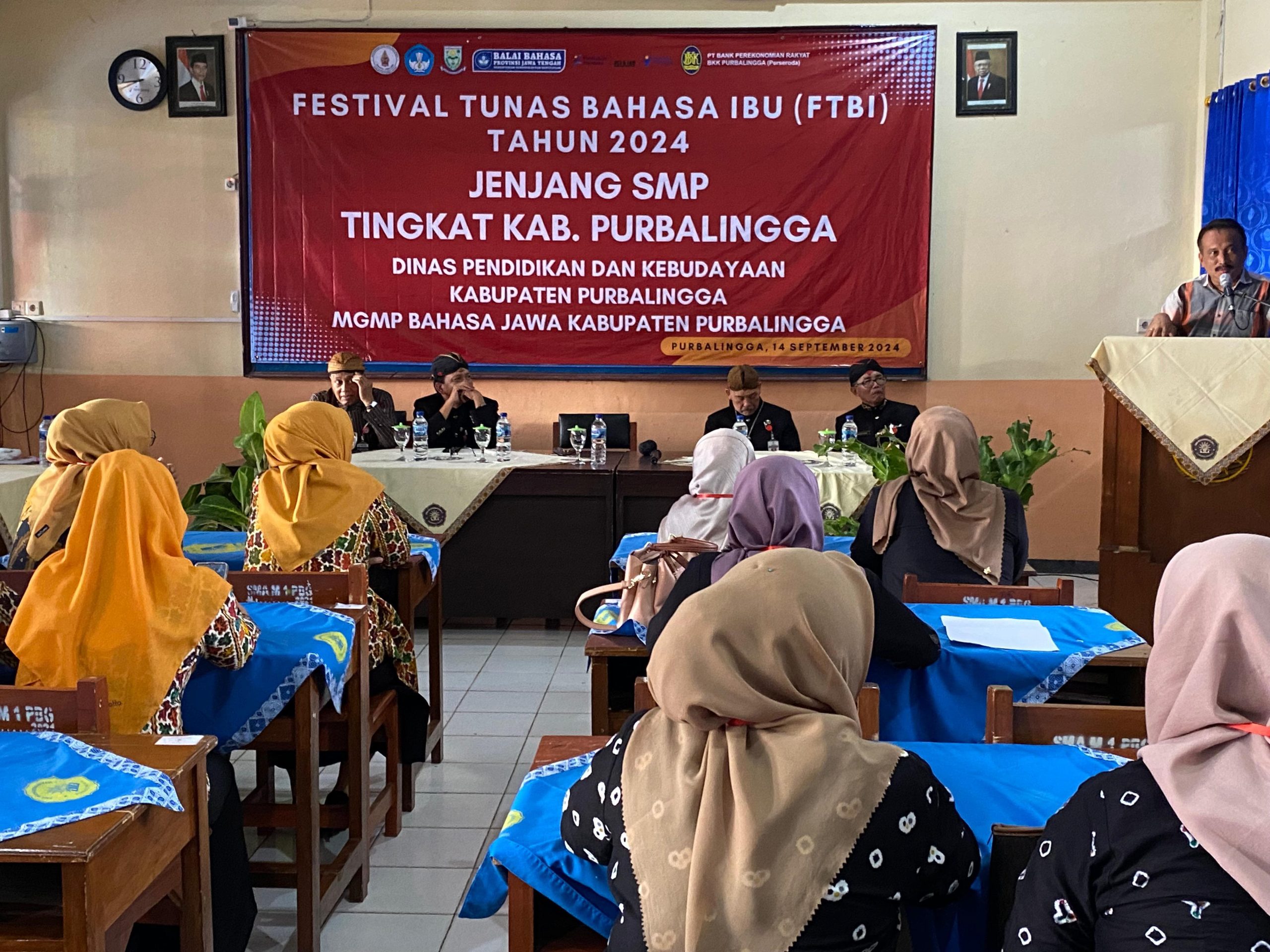 PURBALINGGA – Perhelatan Festival Tunas Bahasa Ibu (FTBI) jenjang SMP Kabupaten Purbalingga tahun 2024 sukses dilaksanakan, kegiatan ini mendapat sambutan baik dari sekolah tingkat SMP di Purbalingga. Sejumlah 435 peserta dari 67 SMP turut berpartisipasi dalam kegiatan yang berlangsung selama satu hari penuh pada Sabtu, 14 September 2024 yang dilaksanakan di SMA Muhammadiyah 1 Purbalingga yang berada di Jl. Alun-alun Selatan nomor 2 Purbalingga.