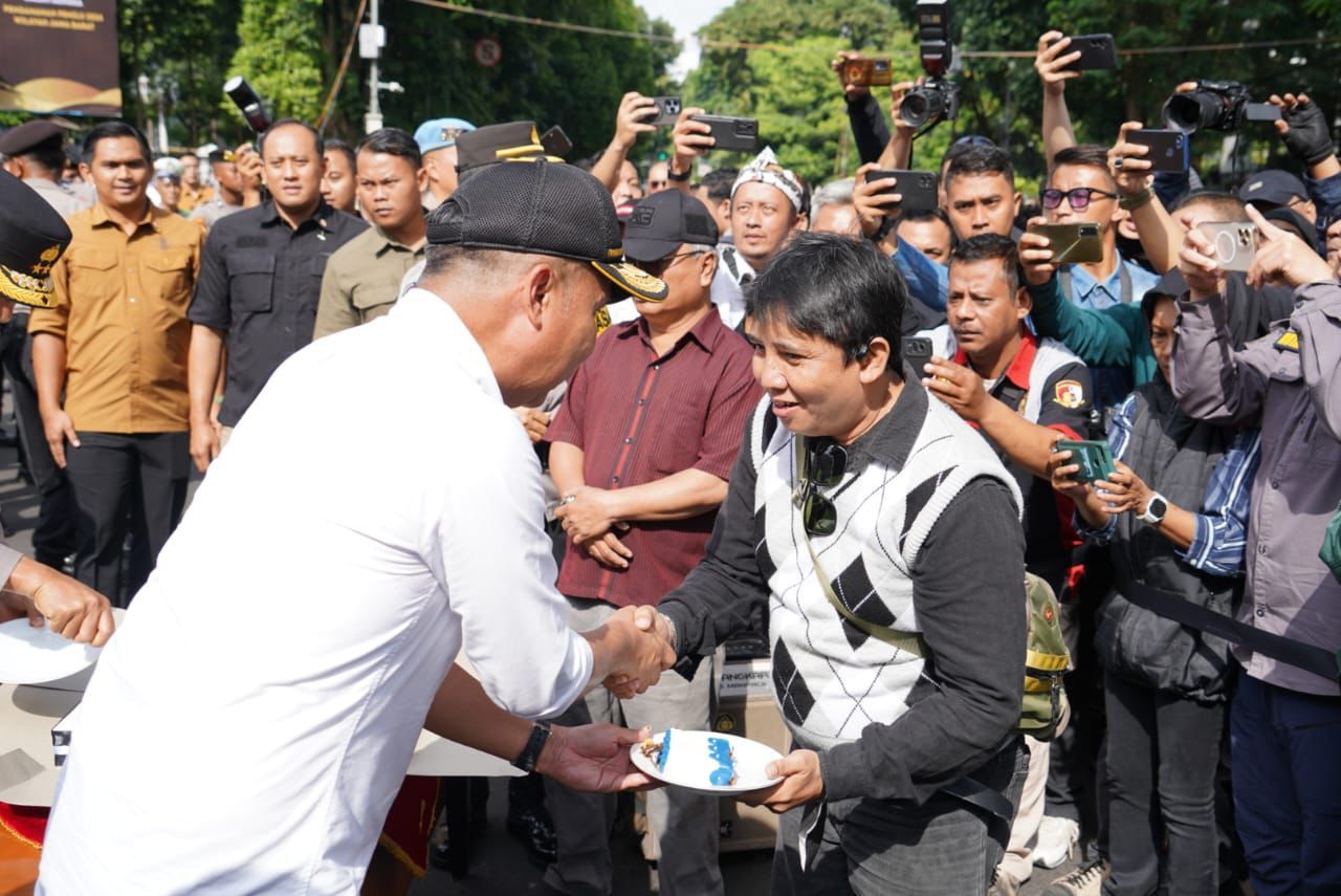 Acara di akhiri dengan simbolis potong Kue yang di wakili oleh PJ. Gubernur Jawa Barat Bey Machmud yang di berikan Kepada perwakilan Jurnalis Polda Jabar Aman Hasibuan.