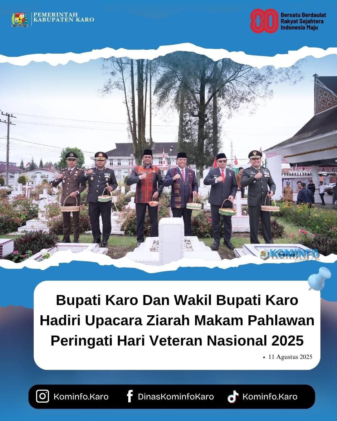 KARO (SUMUT) KOMPAS86.com__, Bupati Karo, Brigjen Pol (Purn) Dr. dr. Antonius Ginting, Sp.OG, M.Kes, didampingi Wakil Bupati Karo, Komando Tarigan, SP, menghadiri upacara ziarah makam pahlawan dalam rangka memperingati Hari Veteran Nasional Tahun 2025. Kegiatan ini berlangsung di Makam Pahlawan Kabanjahe pada Senin, 11 Agustus 2025, dengan suasana penuh penghormatan terhadap para pejuang bangsa.