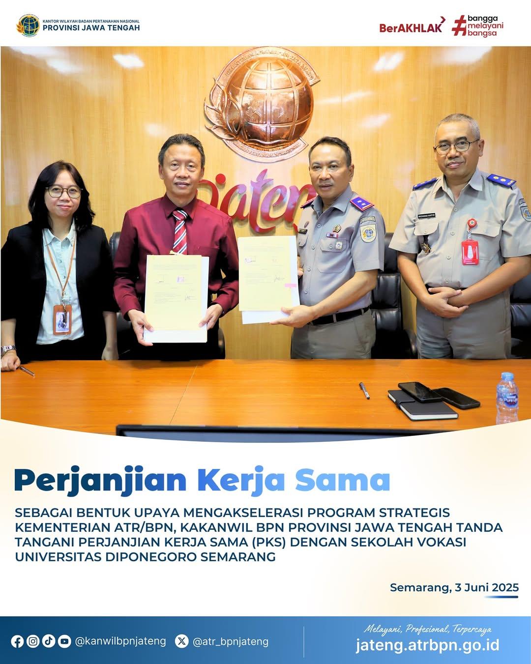 Semarang, 3 Juni 2025 — Kanwil BPN Provinsi Jawa Tengah menjalin kerja sama strategis dengan Sekolah Vokasi Universitas Diponegoro (UNDIP) Semarang melalui penandatanganan Perjanjian Kerja Sama (PKS) yang berlangsung di Ruang Rapat Merapi Kanwil BPN Provinsi jawa Tengah.