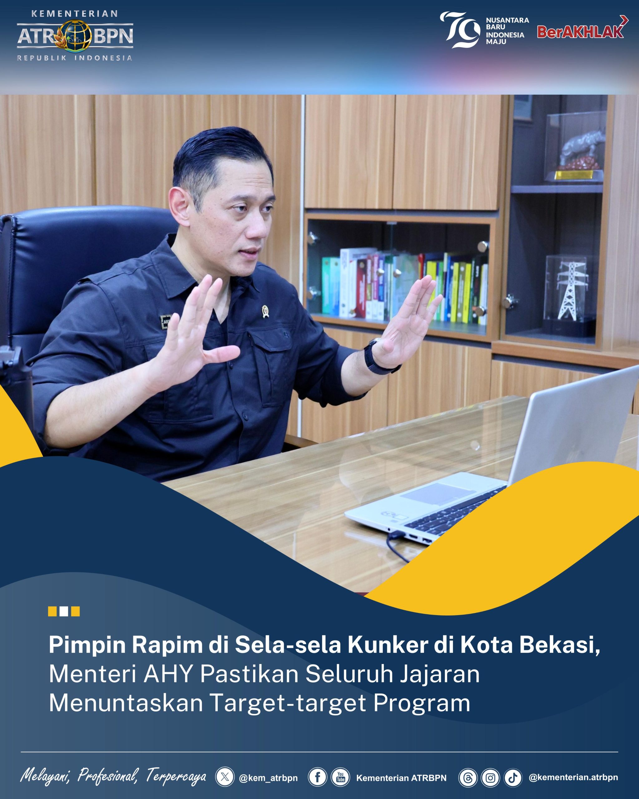 Kota Bekasi,Kompas86.com – Memasuki minggu pertama Agustus 2024, Menteri Agraria dan Tata Ruang/Kepala Badan Pertanahan Nasional (ATR/BPN), Agus Harimurti Yudhoyono (AHY) memastikan jajaran untuk menuntaskan target-target program pada tiap unit kerja Eselon I. Arahan ini disampaikan secara daring dalam Rapat Pimpinan (Rapim) yang berlangsung ketika ia melakukan kunjungan kerja ke Kota Bekasi pada Selasa (06/08/2024).