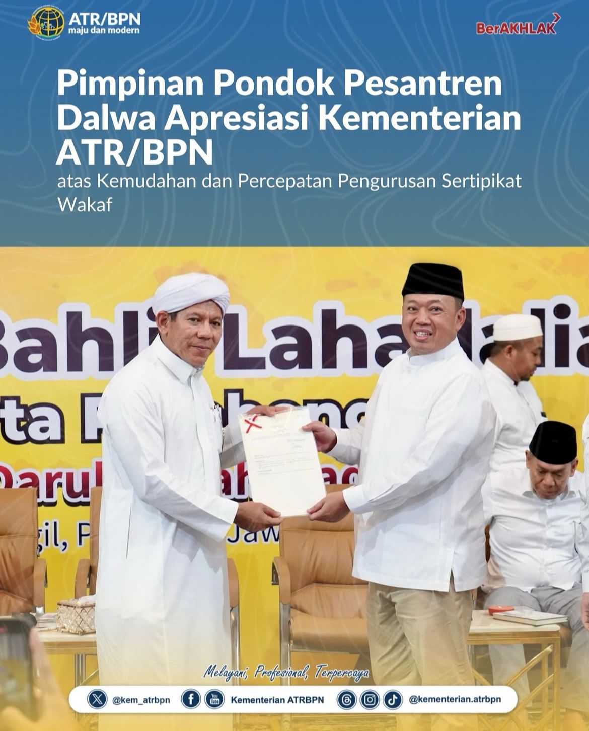 Pasuruan,Kompas86.com – Pondok Pesantren Darullughah Wadda’wah (Dalwa) Pasuruan yang berdiri sejak 1991, akhirnya memiliki sertipikat tanah wakaf. Sertipikat berbentuk elektronik ini diserahkan langsung di pondok pesantren oleh Menteri Agraria dan Tata Ruang/Kepala Badan Pertanahan Nasional (ATR/BPN), Nusron Wahid, pada Jumat (14/03/2025). Sebagai pengasuh sekaligus ahli waris Pondok Pesantren Dalwa, Al Habib Segaf Baharun menyatakan sertipikat wakaf sangat penting untuk menghindari konflik ahli waris di kemudian hari.