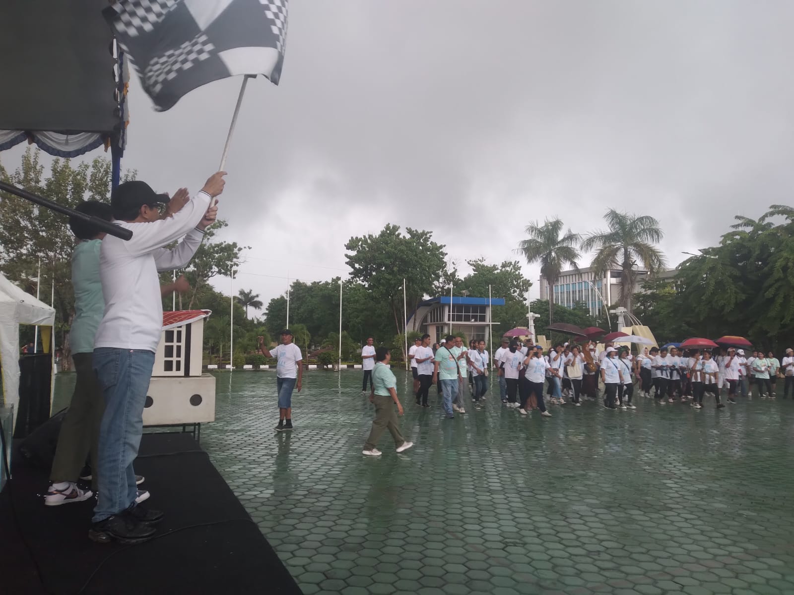 Hujan yang mengguyur Kota Kupang, Sabtu (9/3/2024) pagi, tidak menyurutkan niat masyarakat untuk ikut “Jalan Sehat” Ikasmansa’87. Ini terlihat, saat Penjabat (Pj) Gubernur NTT, Ayodhia Kalake, mengangkat bendera start pertanda kegiatan itu dimulai. Sayangnya, rute jalan sehat terpaksa harus diperpendek, lantaran hujan kian deras. “Semangat peserta luar biasa, walau cuaca tidak bersahabat,” kata Ayodhia Kalake memuji para peserta jalan sehat. Usai jalan sehat, dilanjutkan dengan penarikan hadiah. Ada ratusan hadiah yang disiapkan panitia. Dan.., Athanasius Bunyu memenangkan hadiah utama berupa satu unit motor listrik.