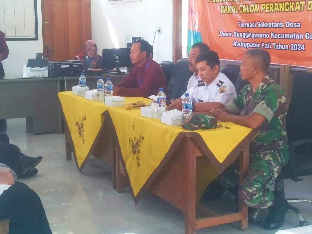 Pati – Saat ini dikabupaten Pati sedang melaksanakan pengisian perangkat desa, pada hari rabu tanggal 16 Oktober 2024, telah dilaksanakan penelitian, uji publik, dan penilaian pengabdian calon perangkat desa Sunggingwarno untuk mengisi lowongan Sekretaris Desa. Kegiatan ini dihadiri oleh unsur kecamatan, Kepala Desa, BPD, dan lembaga desa lainnya, dengan tujuan memastikan pemilihan yang transparan dan berkualitas.