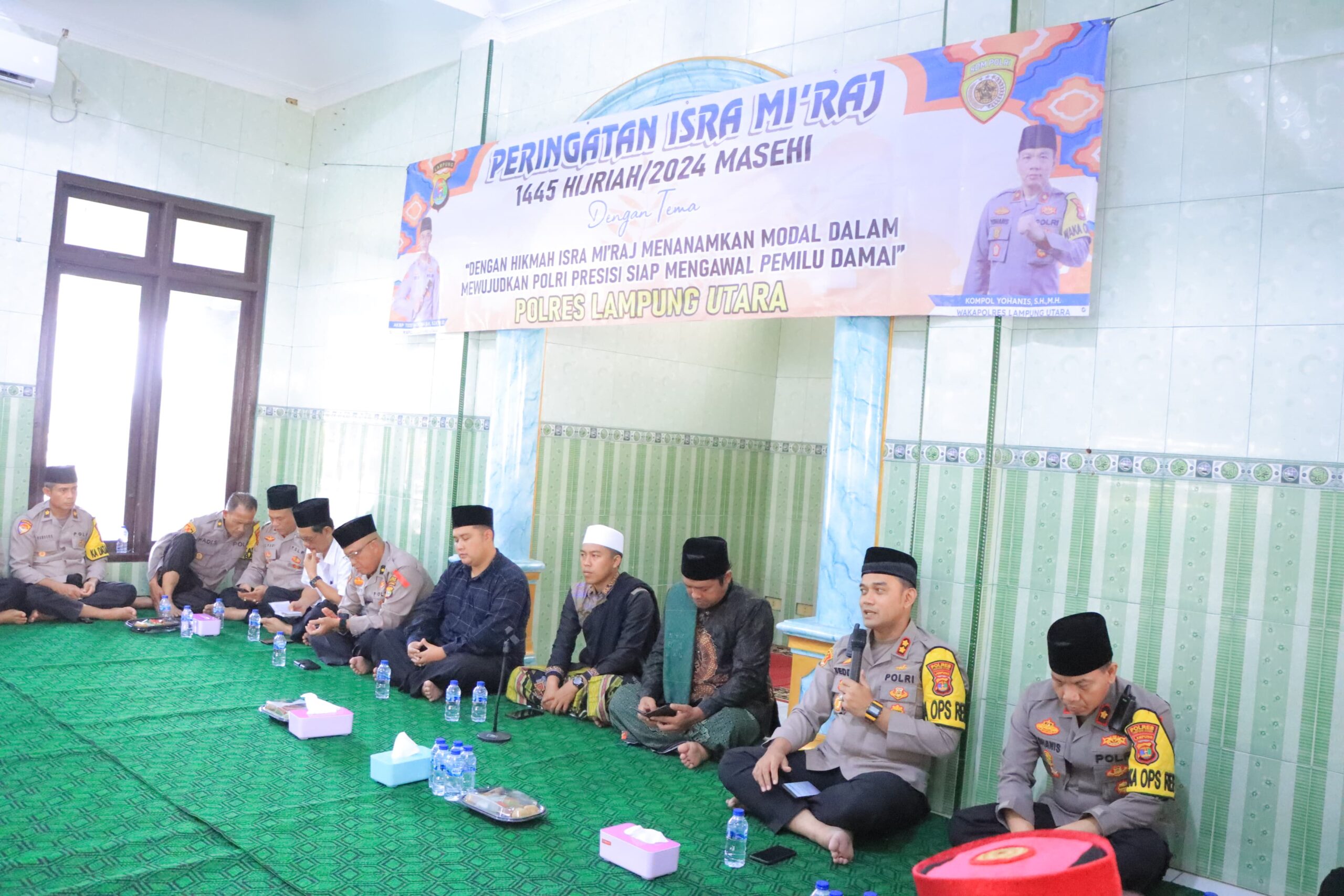 Dengan tema Hikmah Isra Mi’raj menanamkan moral dalam mewujudkan Polri Presisi siap mengawal Pemilu 2024 Damai.