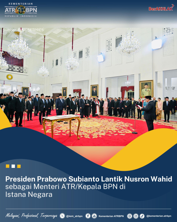 Jakarta – Presiden Republik Indonesia, Prabowo Subianto melantik 53 jajaran Menteri dan Kepala Lembaga Kabinet Merah Putih di Istana Negara, Jakarta, Senin (21/10/2024). Turut dilantik pada hari ini, Menteri Agraria dan Tata Ruang/Kepala Badan Pertanahan Nasional (ATR/BPN), Nusron Wahid menggantikan Agus Harimurti Yudhoyono (AHY) yang baru saja dilantik sebagai Menteri Koordinator Bidang Infrastruktur dan Pembangunan Kewilayahan.