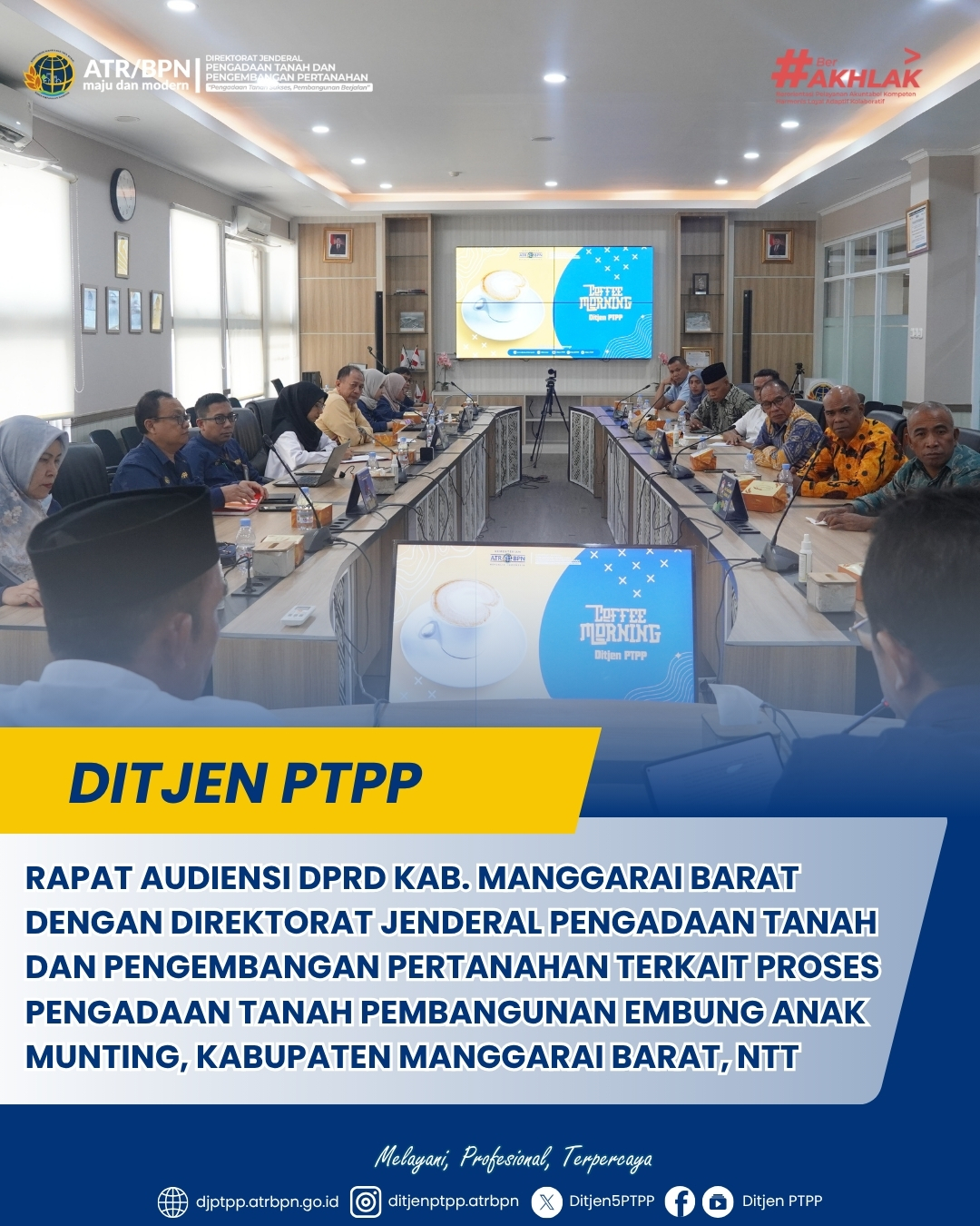 Jakarta, 26 Juni 2025 – Ditjen PTPP menggelar Rapat audiensi DPRD Kab. Manggarai Barat dengan Direktorat Jenderal Pengadaan Tanah dan Pengembangan Pertanahan Terkait Proses Pengadaan Tanah Pembangunan Embung Anak Munting, Kabupaten Manggarai Barat, NTT.