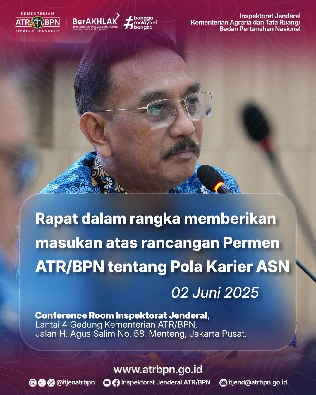 Jakarta – Dalam rangka mendukung perencanaan karier Aparatur Sipil Negara (ASN) yang lebih terarah dan berkelanjutan, Inspektorat Jenderal Kementerian ATR/BPN mengadakan rapat pembahasan guna memberikan masukan atas rancangan Peraturan Menteri ATR/BPN tentang Pola Karier ASN.