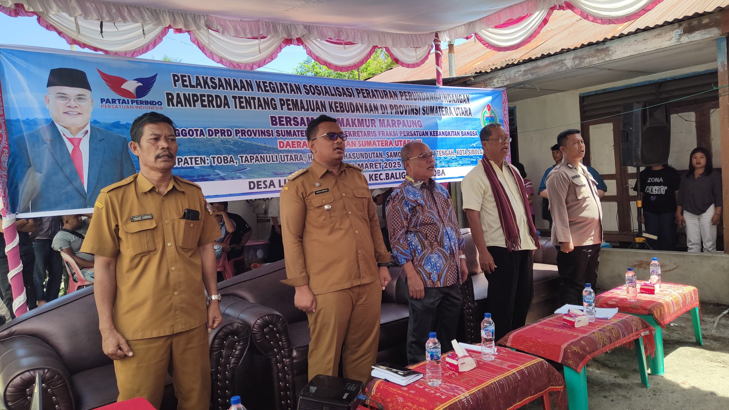 Reses Anggota DPRD Sumut Fraksi Persatuan Kebangkitan Bangsa (Daerah pemilihan 9) dan Ir. Makmur Marpaung menggelar “Sosialisasi peraturan perundang-undangan pemajuan kebudayaan diprovinsi sumatera utara” di desa lumban silintong kecamatan balige kabupaten toba. Tampil mengenakan pakaian Batik Coklat Biru pria kelahiran porsea menampung sejumlah aspirasi akan Ranperda Pemajuan Kebudayaan dihadapan ratusan warga Lumban Silintong pukul 10.00 wib. (Senin,24 Maret 2025)