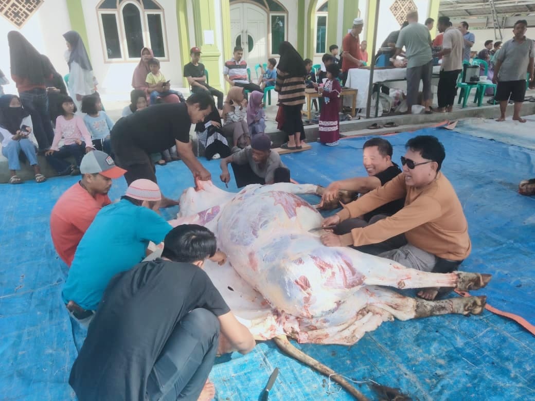 “Alhamdulillah Qurban Tahun ini ada 5 Ekor Sapi,Antusias Masyarakat pun yang hadir sangat luarbiasa,Terimakasih untuk yang telah memberikan Hewan Sapi nya untuk di Qurban kan di Masjid kita ini,semoga rezeki nya semakin berlimbah dan selalu di berikan kesehatan Jasmani dan Rohani”.Ucap pakcik Dayat.