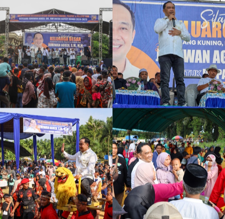 Sementara itu dari atas panggung utama acara sejumlah undangan seperti Dirut Pemenangan Jumiwan Aguza, Dr. H. Khairun A. Roni, Rektor UMB, Dr. Supriyono dan sejumlah tokoh Kuamang Kuning, baik dari kecamatan Pelepat maupun Pelepat Ilir silih berganti memberikan pernyataan dan mengajak masyarakat untuk memenangkan Jumiwan Aguza bersama pasangannya nanti menjadi Bupati dan wakil Bupati Bungo 2024-2029.