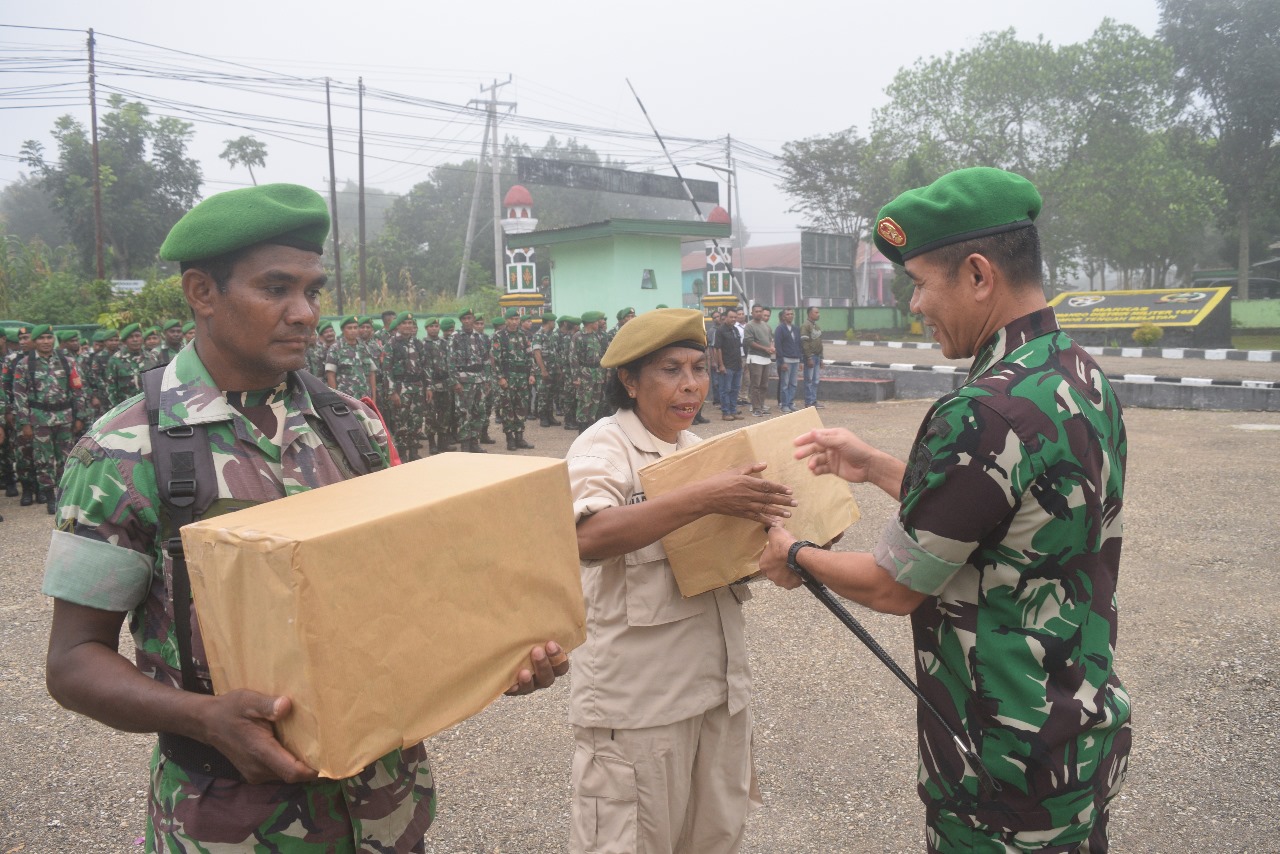 Komandan Kodim 1621/TTS Letkol Inf Sobirin, S.Ag., M.Si, yang diikuti oleh seluruh anggota baik staf maupun Babinsa, karena selain melepas Anggota Dandim juga bagikan bingkisan lebaran kepada seluruh anggota kodim.