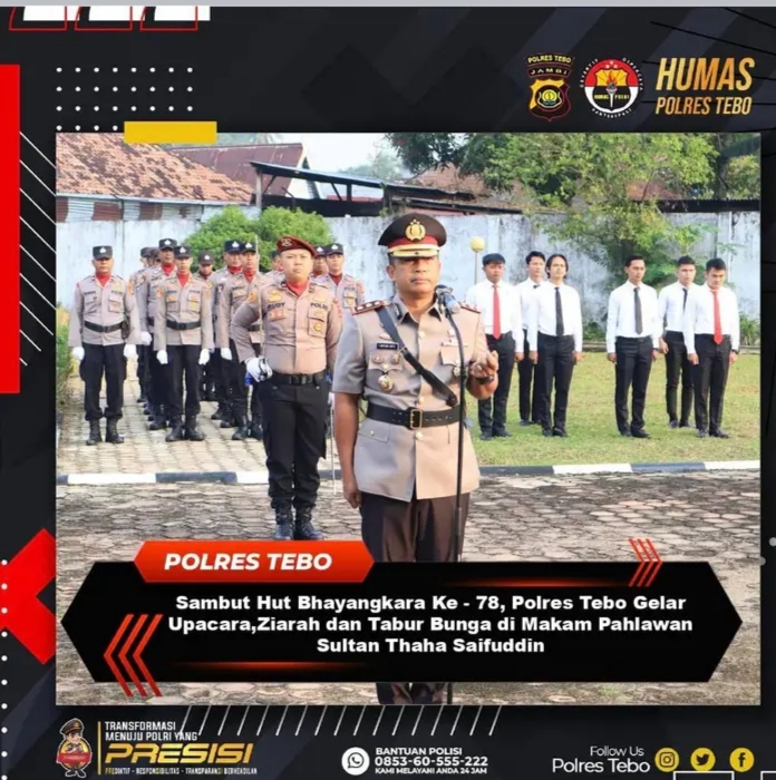 Berbeda dari Peringatan Hari Bhayangkara pada tahun-tahun sebelumnya, kali ini Kepolisian Daerah resor Tebo menggelar Hari Bhayangkara dengan melakukan upacara ,ziarah dan tabur bunga di makam pahlawan sultan Thaha Saifuddin kabupaten Tebo.
