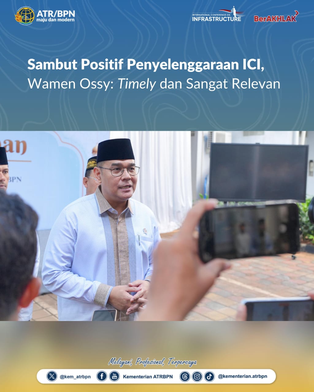 Jakarta – Wakil Menteri Agraria dan Tata Ruang/Wakil Kepala Badan Pertanahan Nasional (Wamen ATR/Waka BPN), Ossy Dermawan, menyambut positif penyelenggaraan International Conference on Infrastructure (ICI). Ia menilai, penyelenggaran forum berskala internasional yang akan diselenggarakan beberapa hari mendatang ini merupakan momentum yang tepat.