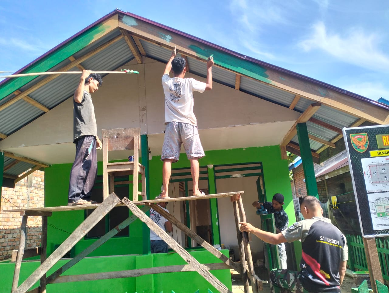 Warga secara sukarela turut serta dalam berbagai pekerjaan, seperti pemasangan seng lisplang dan pengecatan teras rumah. Salah satu warga, Saleh, mengungkapkan rasa antusiasnya dalam kegiatan ini.