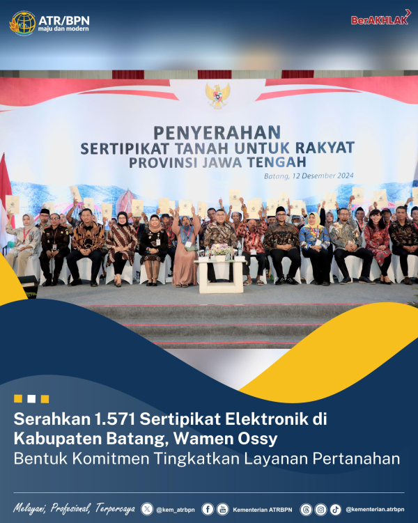 Adapun Sertipikat Elektronik yang diserahkan di Jawa Tengah ini merupakan hasil dari dua program strategis Kementerian ATR/BPN, yaitu hasil program Pendaftaran Tanah Sistematis Lengkap (PTSL) dan Reforma Agraria. Wamen Ossy berharap, sertipikat yang diterima dapat memberikan manfaat yang besar bagi masyarakat.