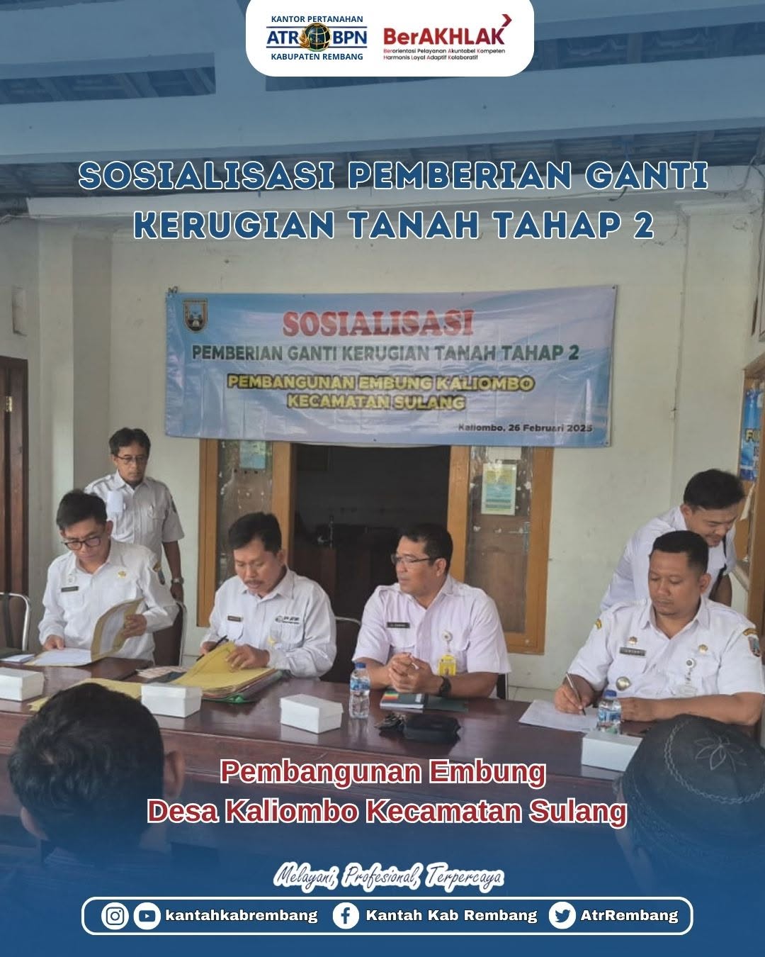 Rembang, Kompas86.com – ​Kantor Pertanahan Kabupaten Rembang melakukan Sosialisasi Pemberian Ganti Rugi Kerugian Tanah Tahap 2 untuk Pembangunan Embung Desa Kaliombo Kecamatan Sulang pada hari Rabu (26/02/2025).