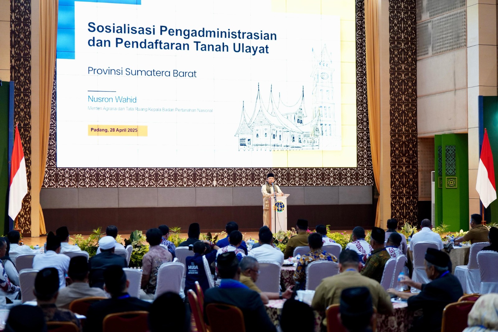 Padang – Menteri Agraria dan Tata Ruang/Kepala Badan Pertanahan Nasional (ATR/BPN), Nusron Wahid, menegaskan komitmen pemerintah untuk melindungi hak masyarakat hukum adat, khususnya terkait tanah ulayat. Pernyataan tersebut ia katakan saat membuka kegiatan Sosialisasi Pengadministrasian dan Pendaftaran Tanah Ulayat di Provinsi Sumatera Barat, yang digelar di Auditorium Universitas Negeri Padang, Senin (28/04/2025).