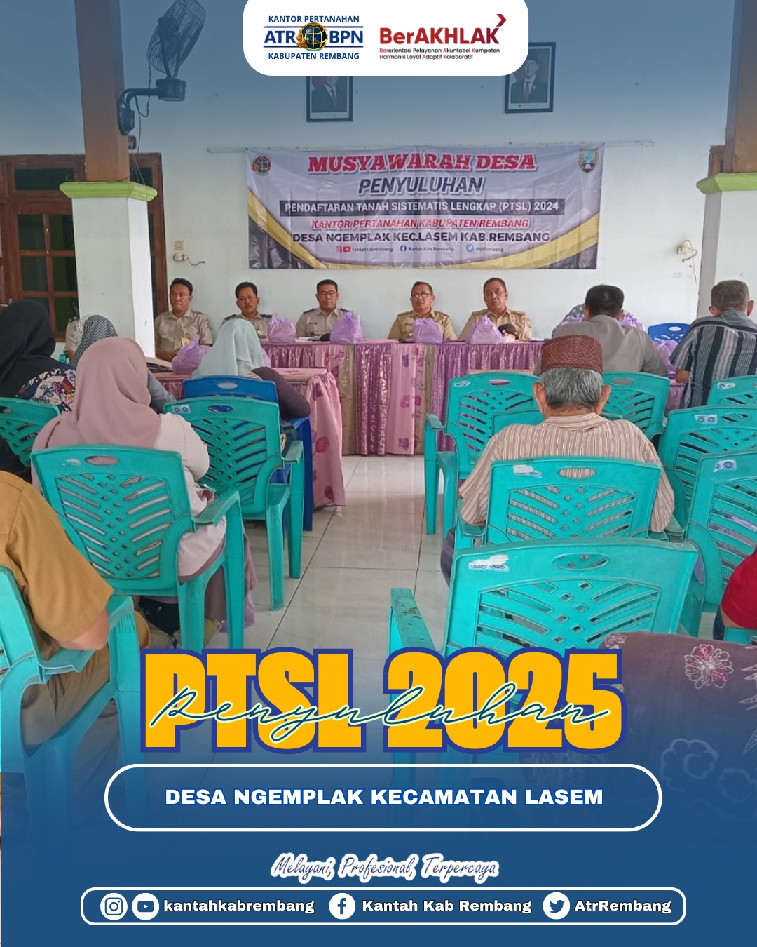 Rembang – Dalam upaya mempercepat legalisasi aset masyarakat, Tim PTSL (Pendaftaran Tanah Sistematis Lengkap) Tahun Anggaran 2025 yang dipimpin oleh Amrianto Samad menggelar kegiatan sosialisasi program PTSL di Balai Desa Ngemplak, Kecamatan Lasem.