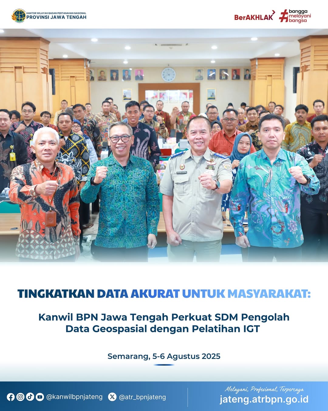 Semarang, 5 Agustus 2025 — Kepala Bidang Survey dan Pemetaan Kanwil BPN Jateng, Defiandi Gustian, mewakili Kakanwil BPN Jateng, resmi membuka Pelatihan Pengelolaan dan Pemanfaatan Informasi Geospasial Tematik (IGT) di Aula Sentosa, Semarang.