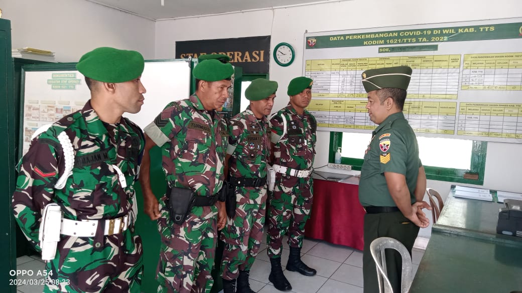 ” Ya saya perintahkan agar petugas piket melaksanakan Serah Terima pada anggota lainnya saat bergantian Jaga,” ujar Dandim 1621/TTS Letkol Inf Sobirin,S.Ag.,M.Si.,saat di temui Kapendim Serka Juandi, bertempat di Makodim 1621/TTS Jl.Gajah Mada Kelurahan Cendana ,kecamatan Kota Soe, Kabupaten Timor Tengah Selatan, Senin (25/03/2024).