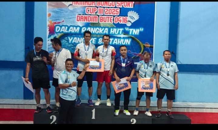 Turnamen Badminton Syariah dalam rangka memperingati HUT Ke-80 TNI tahun 2025 resmi ditutup oleh Komandan Kodim 0416/Bute Letkol Inf Dedy Pungky Irawanto, S.I.P., M.I.Pol., di Hall Armada Bungo Sport, Kelurahan Pasir Putih, Kecamatan Rimbo Tengah, Kabupaten Bungo, Minggu Malam (06/10/2025).