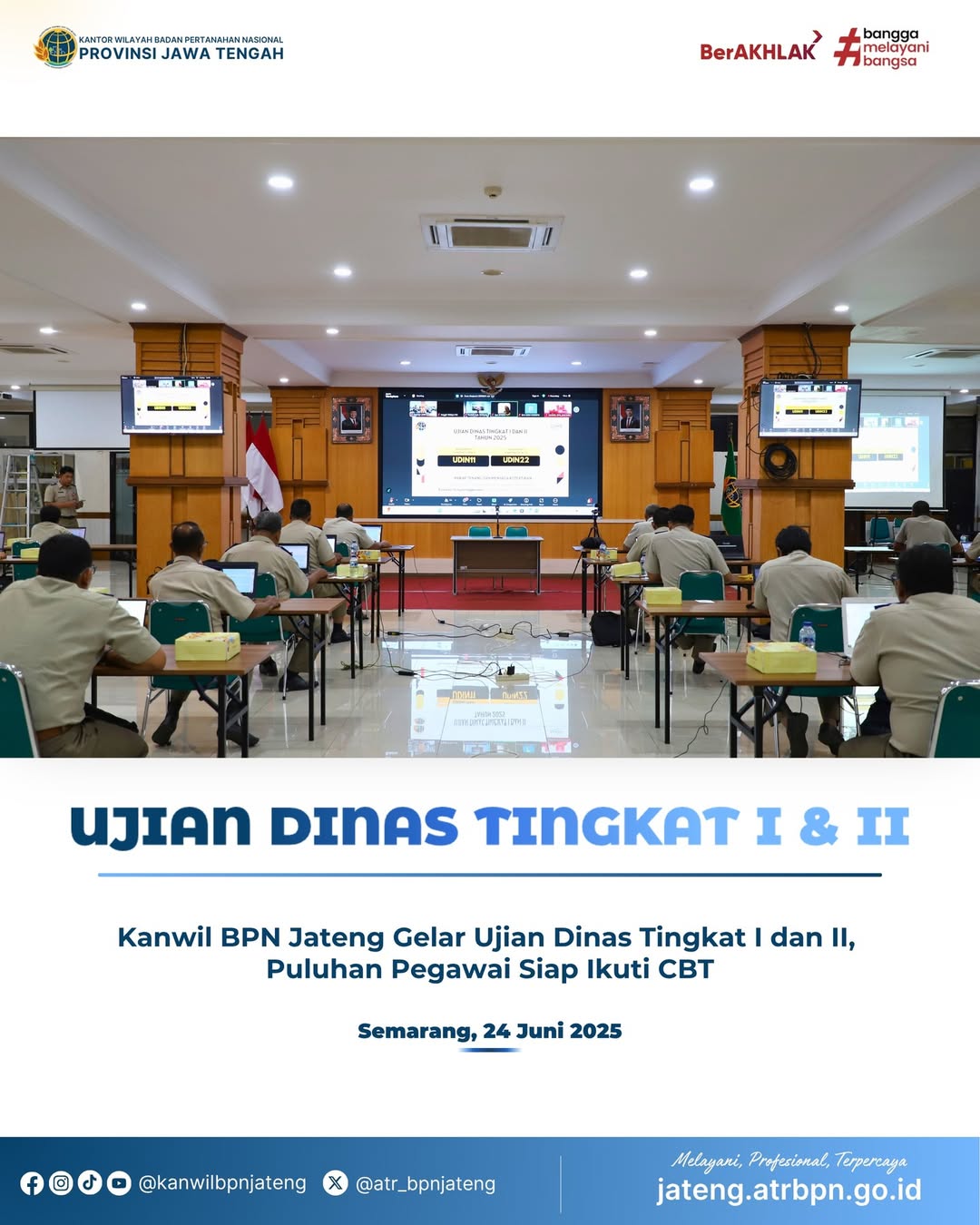 Semarang, 24 Juni 2025 — Kanwil BPN Provinsi Jawa Tengah menyelenggarakan Ujian Dinas Tingkat I dan II bagi pegawai di lingkungan BPN Jawa Tengah yang dilaksanakan di Aula Sentosa Kanwil BPN Provinsi Jawa Tengah.