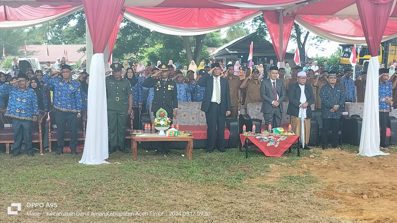 Camat Darul Aman Azani S.E bertindak sebagai pembina upacara dalam pidatonya ia mengatakan jika semangat kemerdekaan harus tetap selalu kita gelorakan bersama sebagaimana semangat para pahlawan dan pejuang dalam merebut kemerdekaan