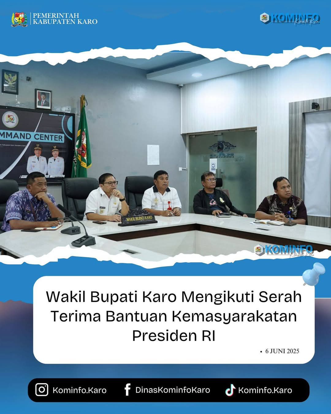 KARO (SUMUT) KOMPAS86.com__, Wakil Bupati Karo, Komando Tarigan, SP, menghadiri kegiatan serah terima Bantuan Kemasyarakatan Presiden berupa sapi kurban yang dilaksanakan secara daring pada Kamis, 5 Juni 2025. Kegiatan ini merupakan bagian dari upaya pemerintah untuk menyambut Hari Raya Idul Adha 1446 Hijriah dan meningkatkan kesejahteraan masyarakat.