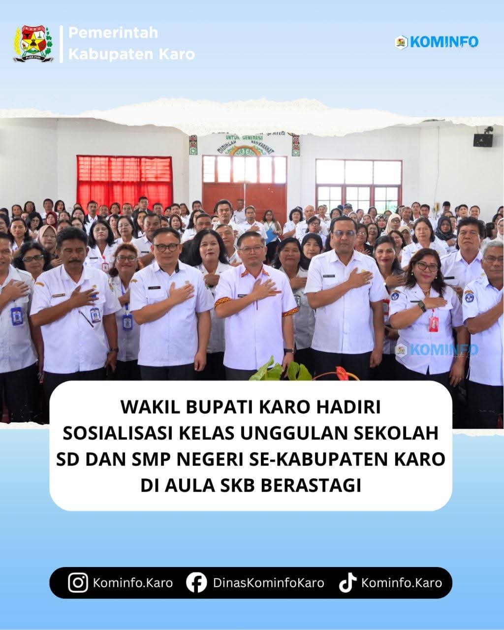 Wakil Bupati Karo, Komando Tarigan, SP., menghadiri sosialisasi Kelas Unggulan Sekolah SD dan SMP Negeri Se-Kabupaten Karo yang dilaksanakan di Aula SKB Kabupaten Karo Berastagi. Dalam kesempatan ini, Wakil Bupati Karo menekankan pentingnya kepemimpinan yang baik dalam mewujudkan pendidikan yang berkualitas, pada Rabu (25/6/2025)